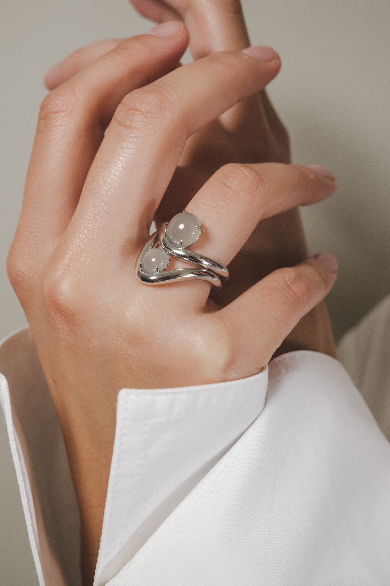 In the center of this ring is the natural gemstone Moonstone, known for its captivating glow that shifts from soft white to flashes of blue. Moonstone is cherished for its mystical beauty and calming energy, inspiring a sense of clarity, serenity, and emotional insight.