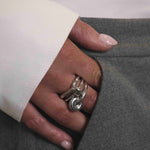 The Dusk Ring is a playful piece that celebrates twilight, inspired by the moment when the sun meets the horizon. Its design features one ring twirling around the other, capturing the timeless beauty of dusk. Perfect for stacking, it pairs beautifully with other Dusk Rings or Dawn Rings.