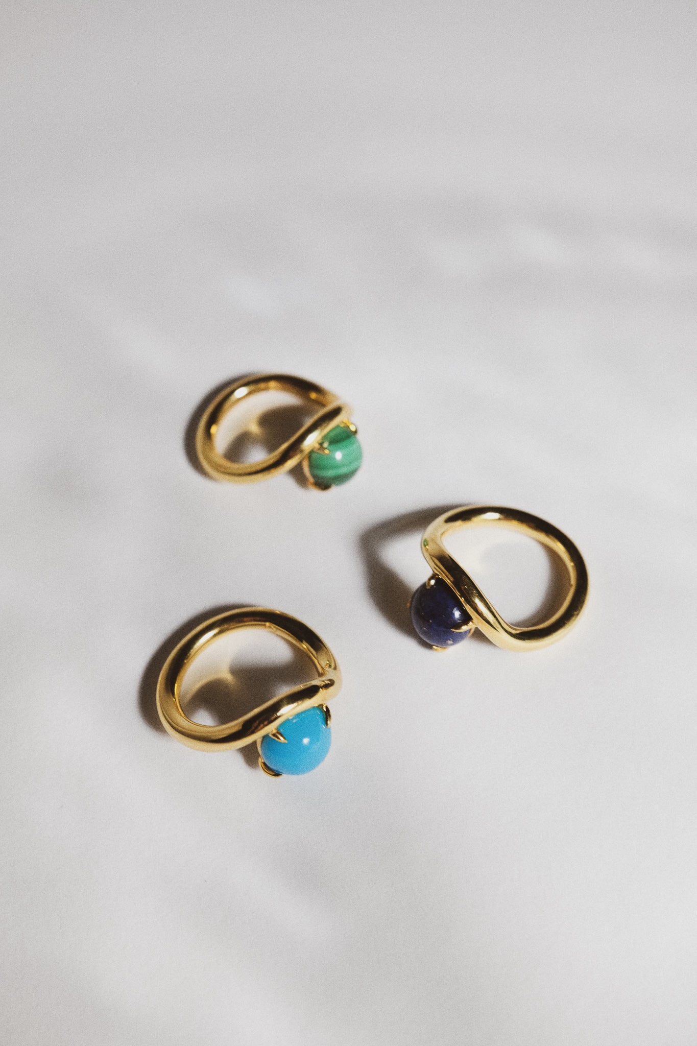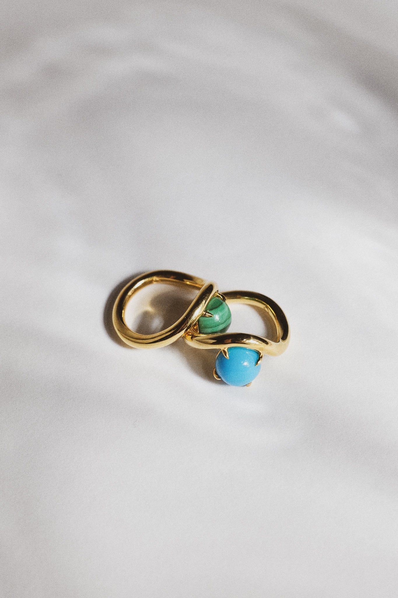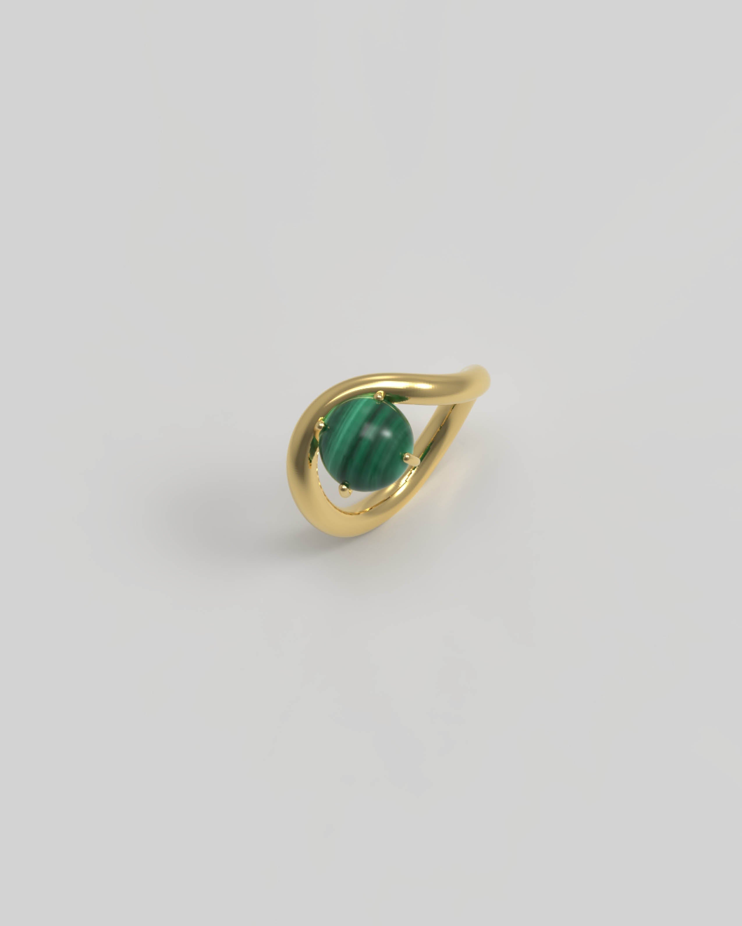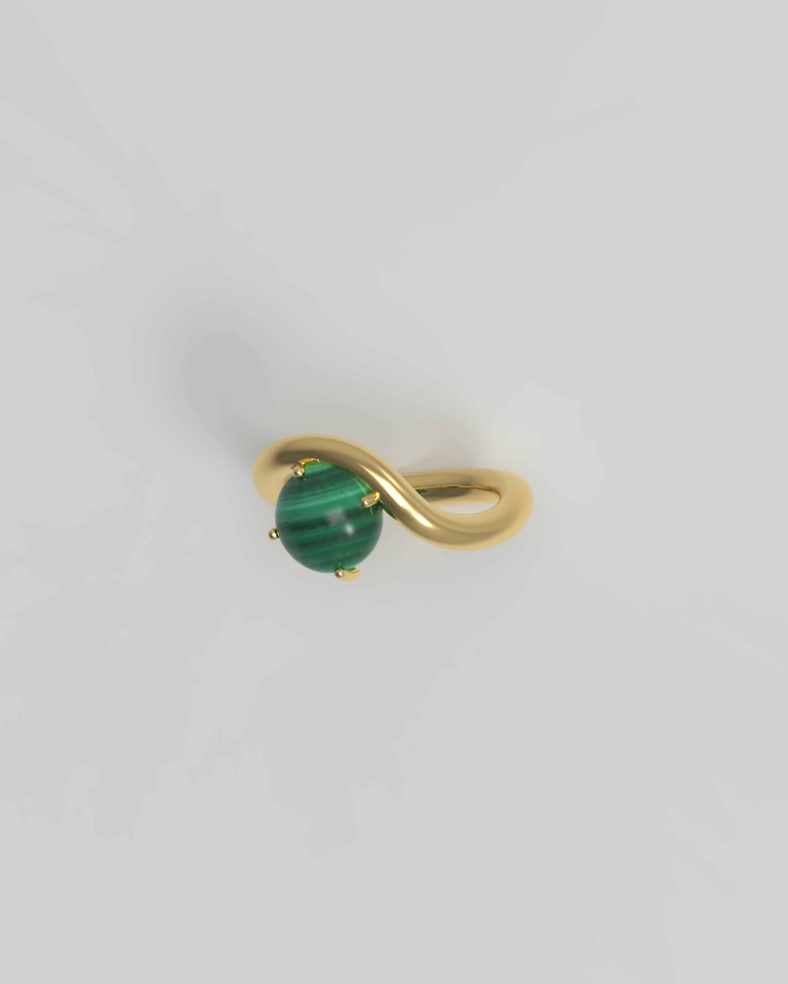 This ring holds the natural gemstone Malachite, characterized by its vibrant green color with unique banding patterns. Malachite symbolizes transformation, protection, and balance, embodying qualities of growth and healing.