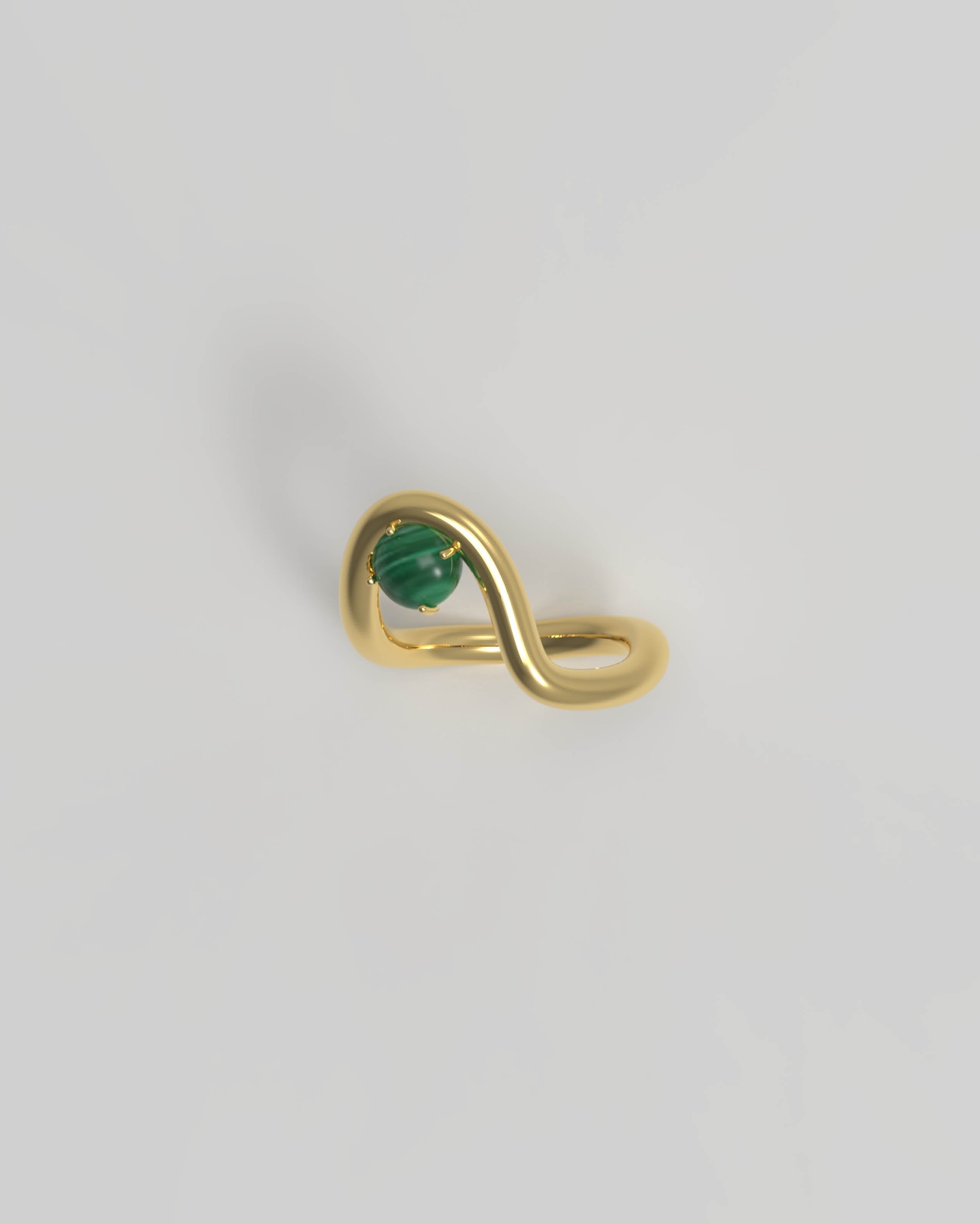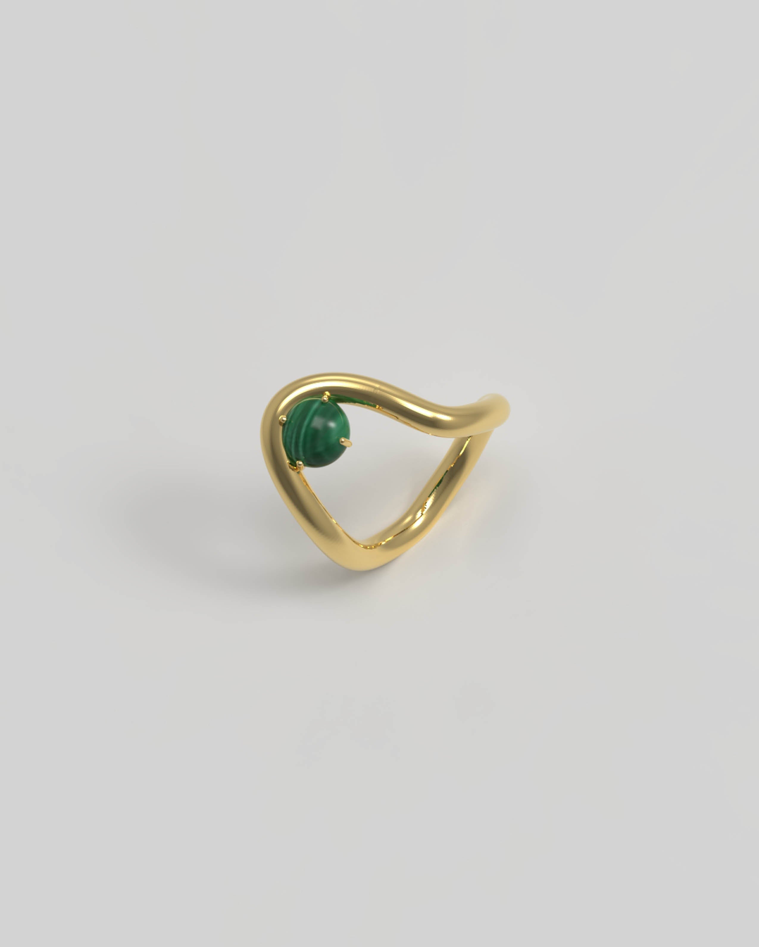 This ring holds the natural gemstone Malachite, characterized by its vibrant green color with unique banding patterns. Malachite symbolizes transformation, protection, and balance, embodying qualities of growth and healing.