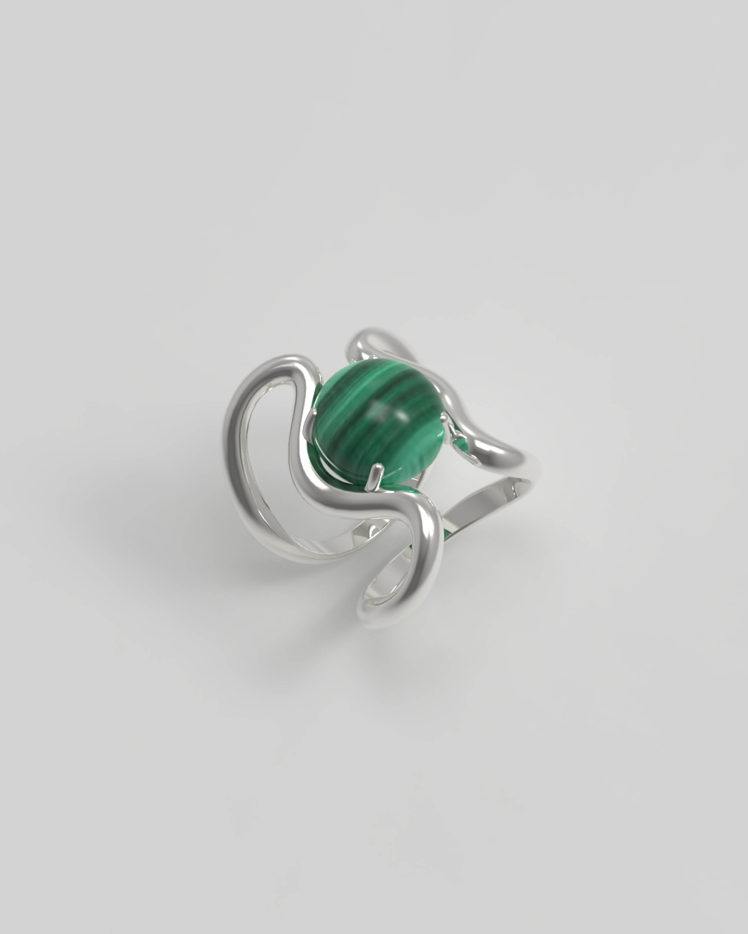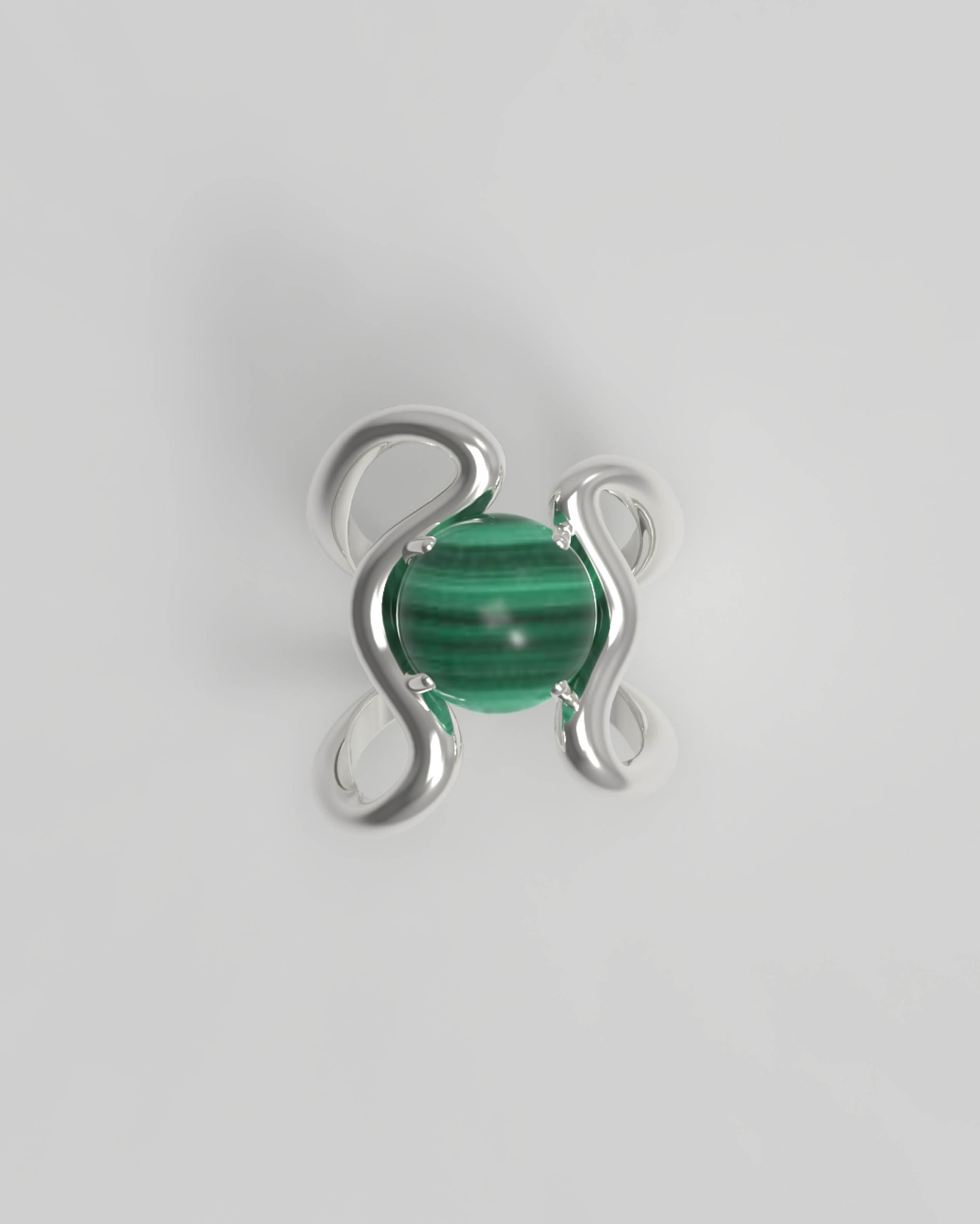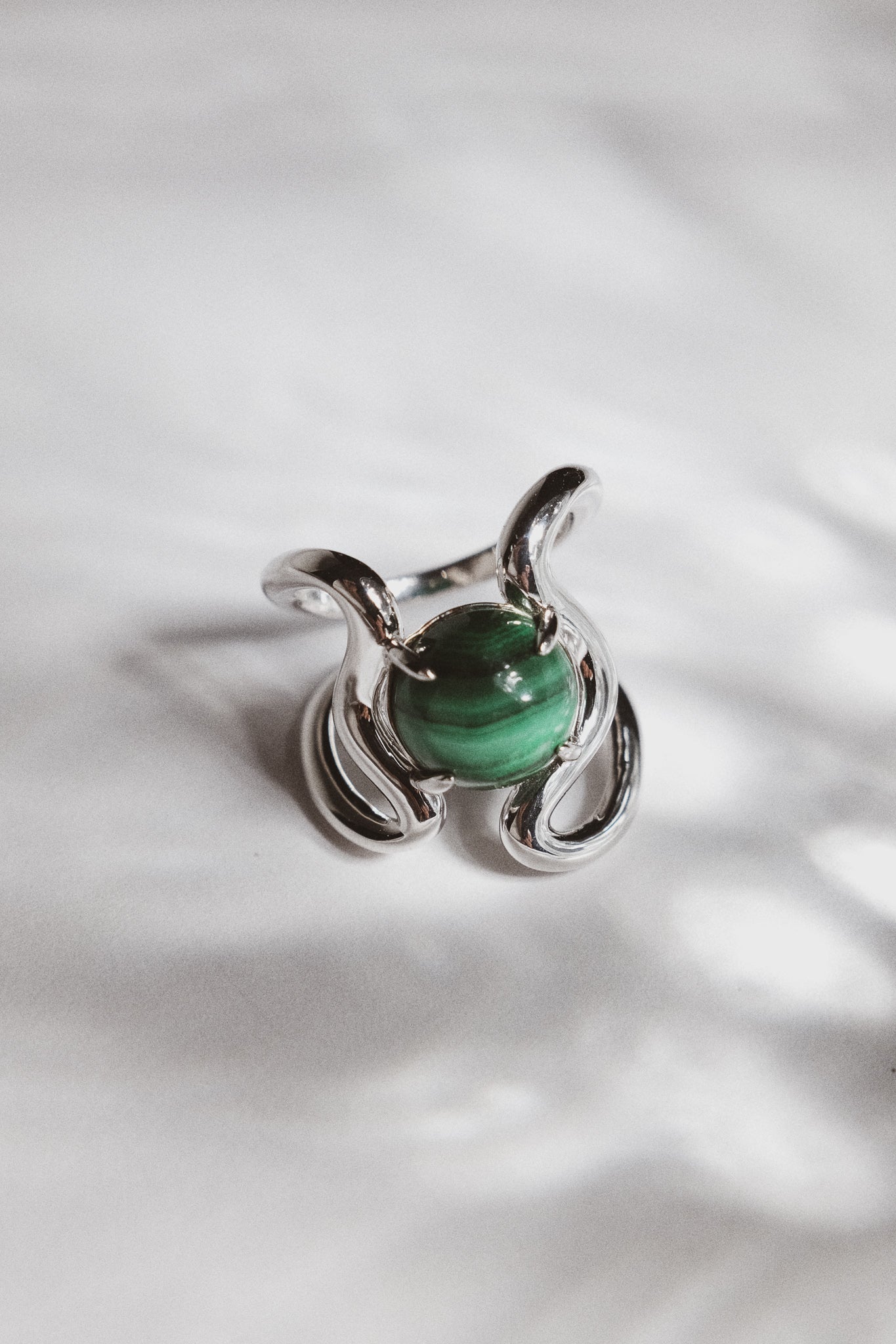 In the center of this ring is the natural gemstone Malachite, characterized by its vibrant green color with unique banding patterns. Malachite symbolizes transformation, protection, and balance, embodying qualities of growth and healing.
