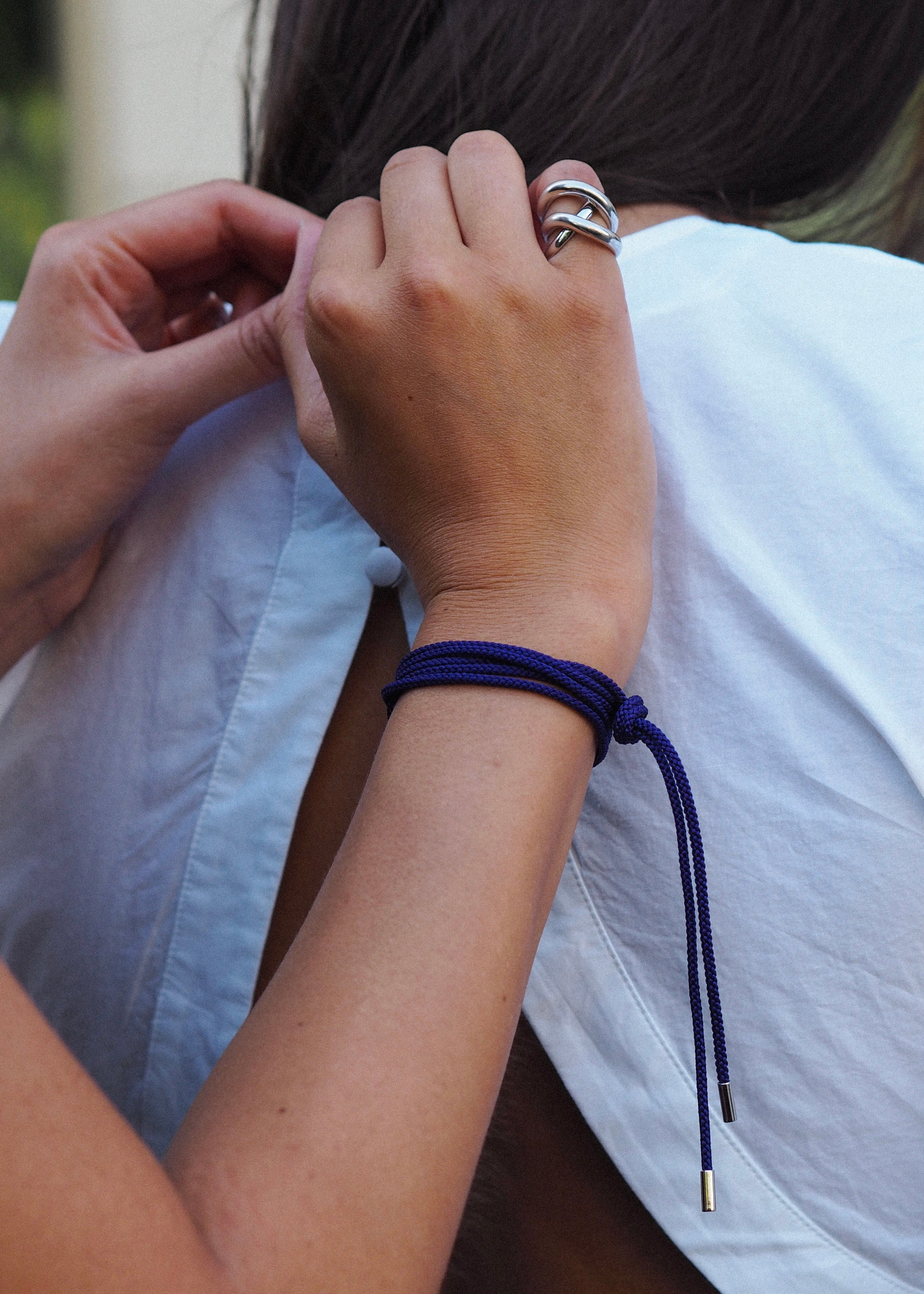 Today, our silk cords retain this heritage, handcrafted in Japan with silver and gold end pieces. This playful piece of jewellery offers versatile wearing options and can be paired with various colors. You can tie the cord around your wrist or neck, with or without a pendant.