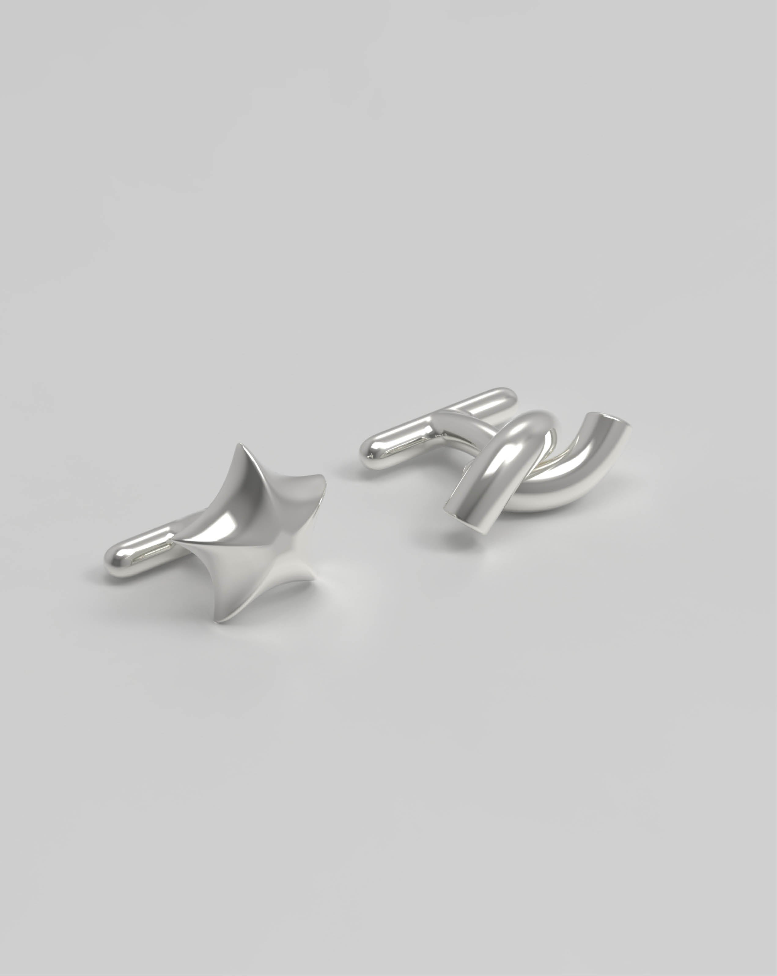 This pair of cufflinks are a mix between Rose and Star. The Star Cufflink is a bold statement inspired by the deep blue sea, designed to stand out. The Rose Cufflink is a solid, sculptural piece designed to make a statement. Inspired by the rose in full bloom as seen from above, it symbolizes love and beauty.